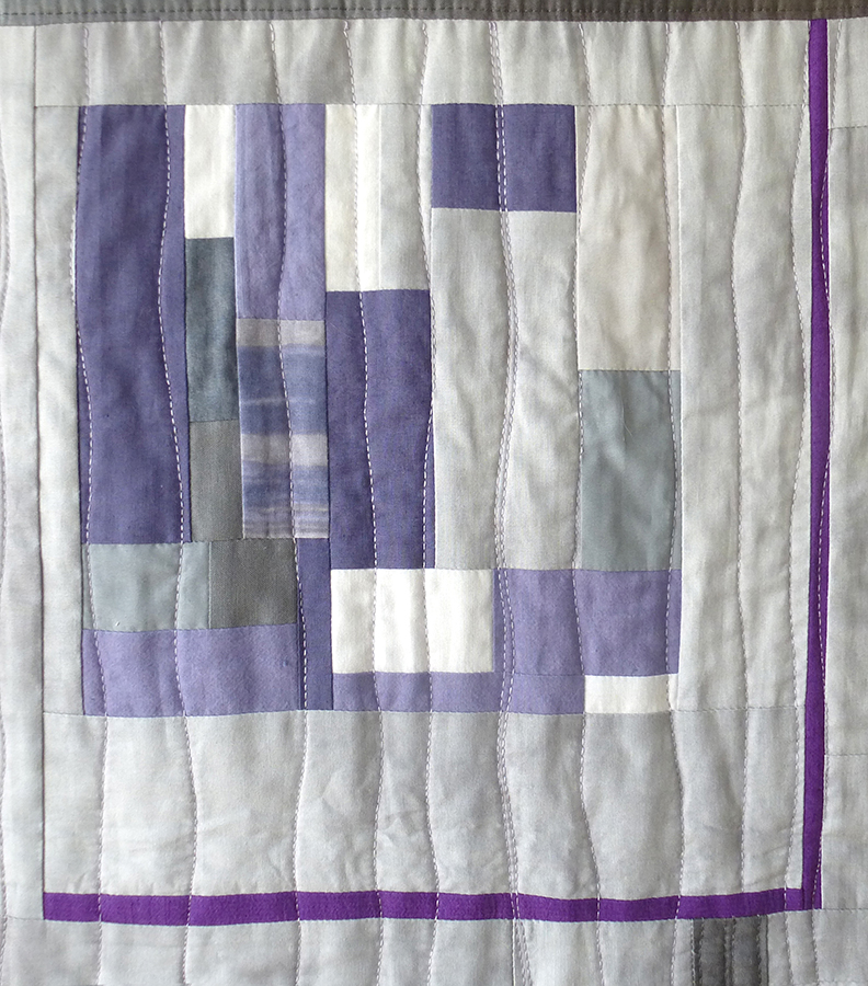 After it was finished, this quilt reminded me of fog and wildflowers; hence its title. But I didn’t design it to represent those things. I made it in burst of improvisational fervor and intentional editing, inspired by dozens of grey and lavender fabrics in my stash. That may seem contradictory, but both approaches—improv and intention—are part of my design process. While I may start by winging it, at every seam there are choices about colors, shapes, sizes. And it took a purposeful, distinctive addition—repeating, ombré L-shapes—to tie the patchwork into a lively composition.