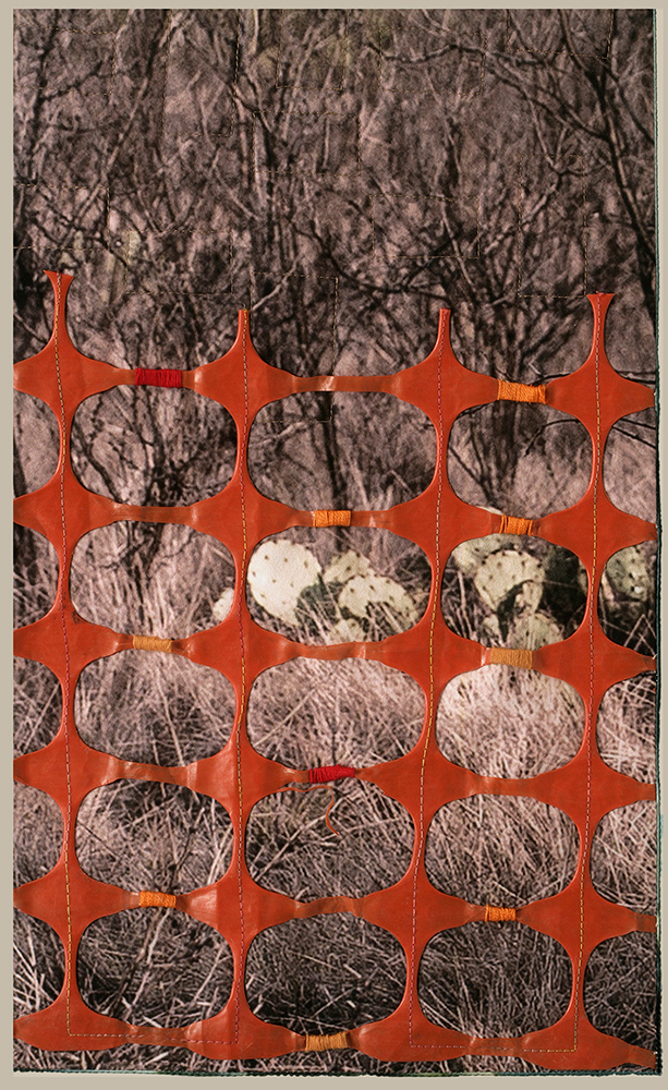 My satiric take on a prototype wall for the US–Mexico border, this quilt features recycled fencing strung between fabric “slats” that are surprisingly green in so arid a landscape … and somehow familiar. That’s because they come from a disgraced icon: the patinated copper from the Statue of Liberty.