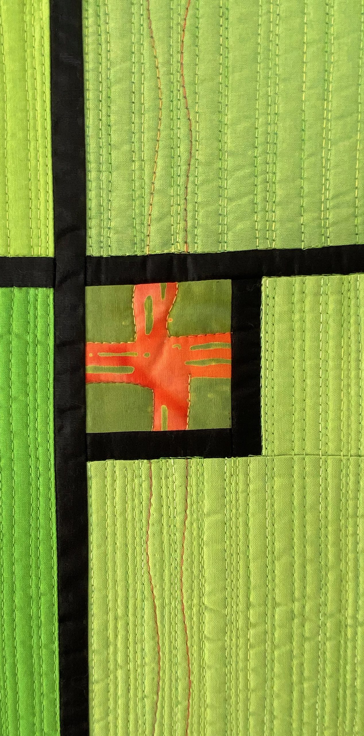 Ombré Greens is a celebration of golden-rectangle proportions. Both the inner rectangle (constructed with green shot-cottons and a pop of a Marcia Derse print) and the overall quilt (cut from ombré yardage) roughly approximate golden rectangles.