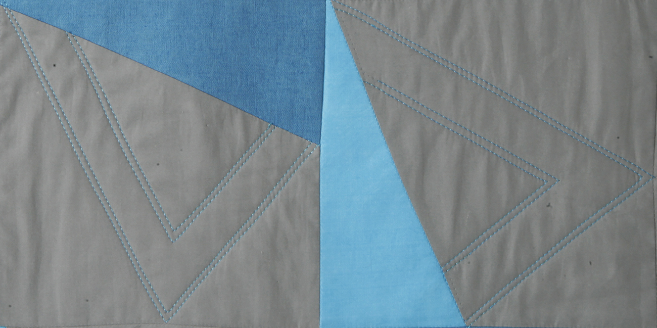 There’s an almost kinetic feel to this minimalist quilt, thanks to contrasting blue triangles that appear to twist and turn along diagonal paths. Hand-dyed fabrics by Maureen Schmidt in Santa Rosa,California—azure silk and cerulean linen—give the triangles maximum impact.
